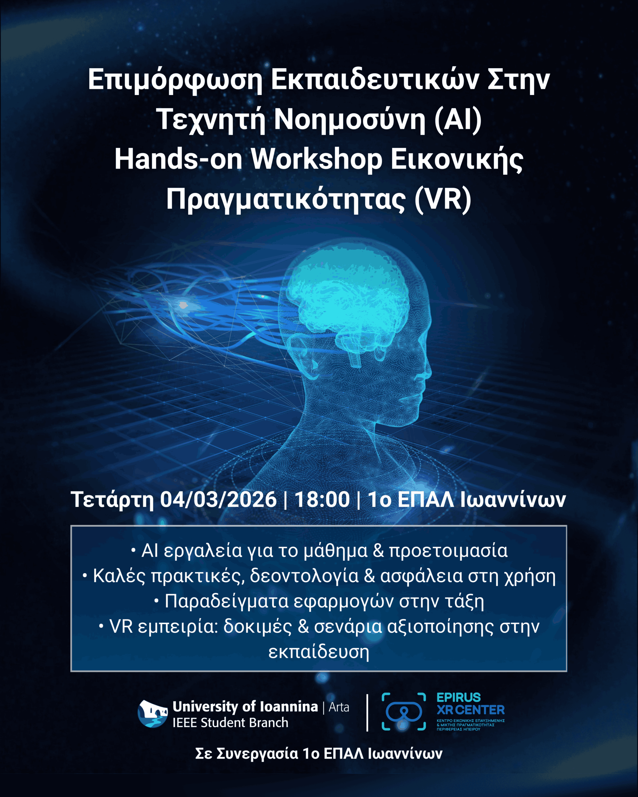 26 Φεβρουαρίου 2026 Anouncement,Event Επιμόρφωση Εκπαιδευτικών με θέμα: «Τεχνητή Νοημοσύνη και VR Workshop» Επιμόρφωση Εκπαιδευτικών με θέμα: «Τεχνητή Νοημοσύνη και...